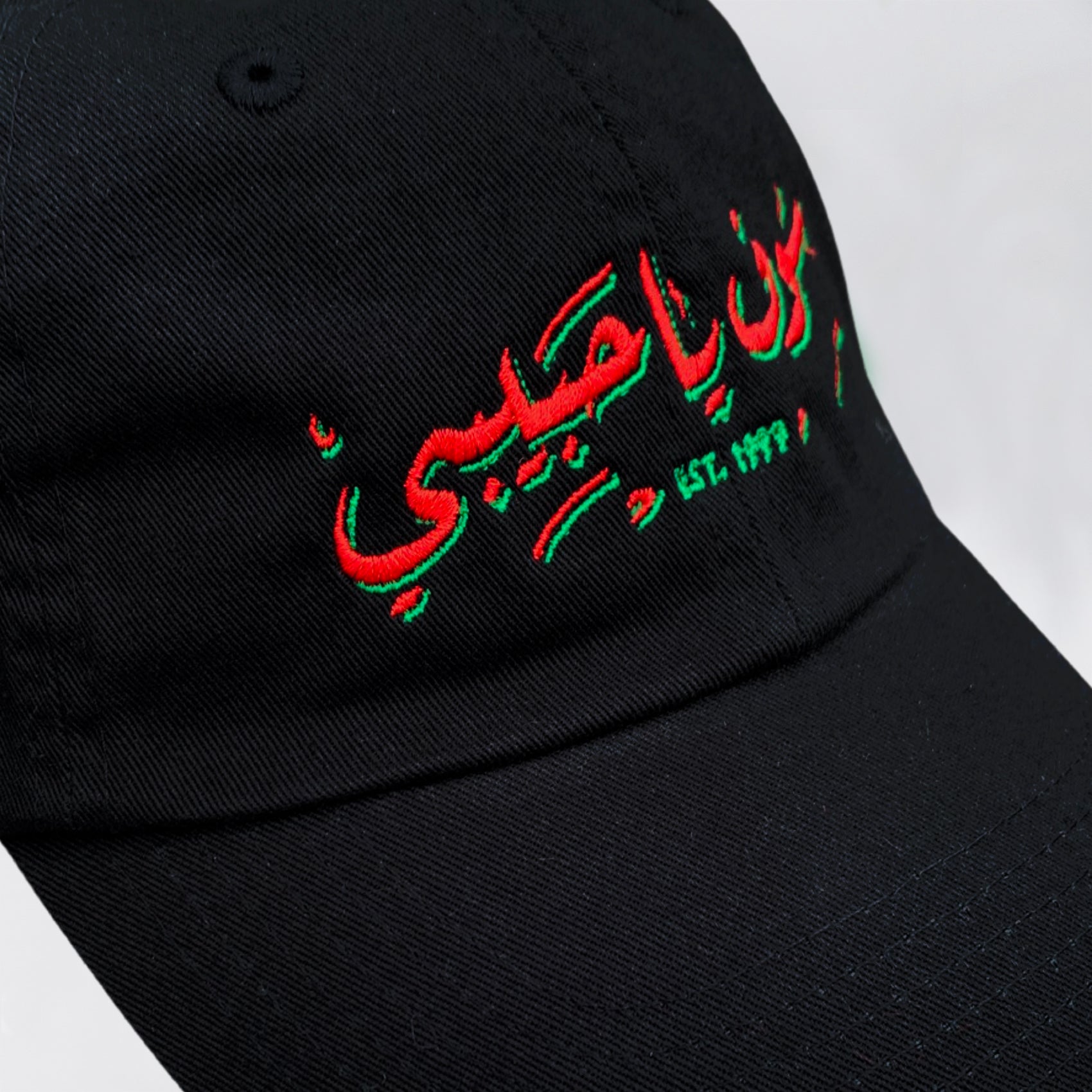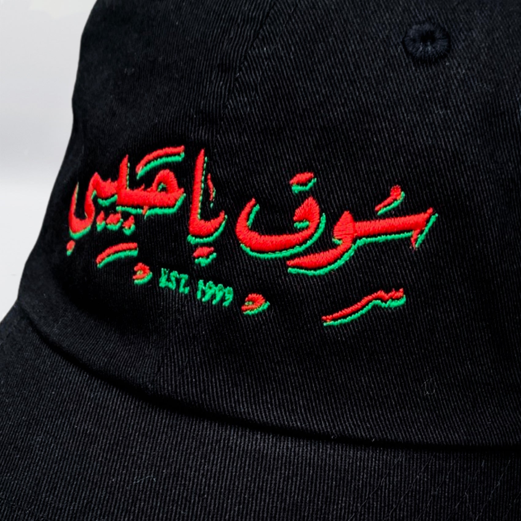 Ya Habibi Market dad Hat in black, features red and green embroidery detailing. Fabricated in cotton twill, this cap has an adjustable strap with metal buckle at rear.